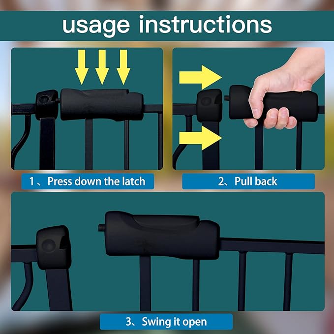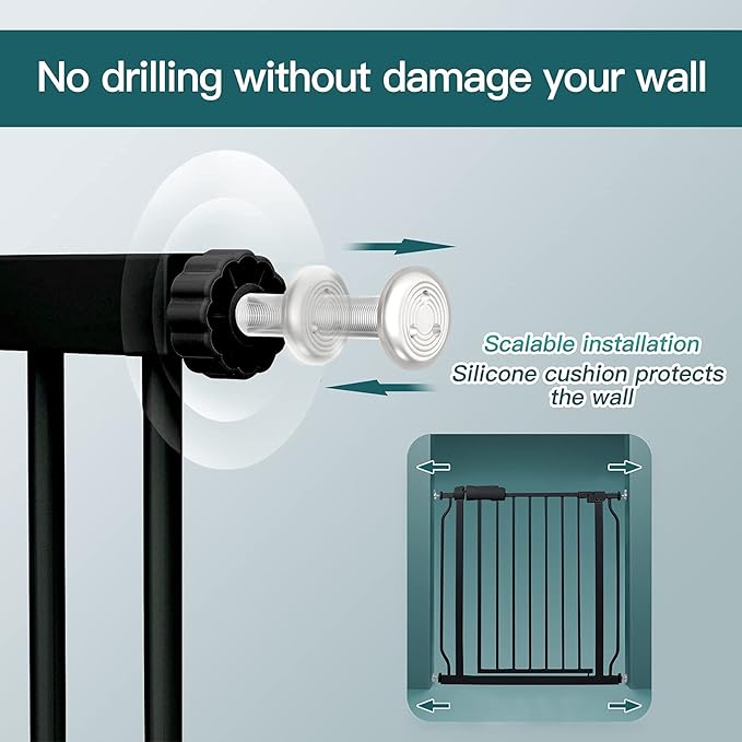 - Double-sided & Auto Close-Our Large Extra wide pressure mounted baby gate will auto close when handle released.The gates for kids or pets includes a Hold- Opening feature when the large baby gate opening angle is 90 degree to keep the gate opened easily walk through without always opening and closing. The indoor safety baby gate has a 180 degree two-way open design which allows you to open in two directions for easy entry and exit.