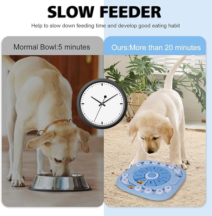 - 【Upgrade Dog Slow Feeder】 Combining circular orbit sliding game and linear orbit sliding game, smart dog and cat must move the slider correctly to get the food reward hidden in the maze. Three different difficulty designs and the 24-hole dog treat dispenser design maximize slow feeding time, even beyond 30 minutes.