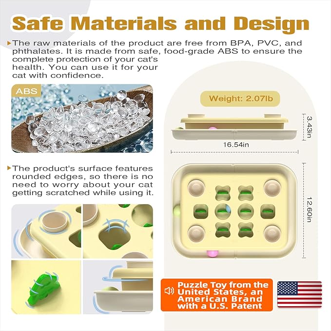 - [Food-Grade ABS, BPA-Free] Rounded, Cat-Friendly + Easy to Clean & Stable. Made from durable food-grade ABS and free of BPA, PVC, and phthalates. Smooth, rounded edges are designed for comfortable everyday play, and the sturdy construction is built to handle regular batting, chasing, and puzzle sessions. Easy to clean—simply rinse with water for quick daily hygiene. Equipped with a non-slip base to help keep it steady and prevent sliding during play and feeding.