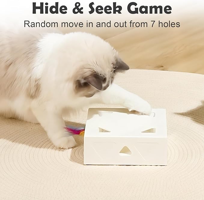 - MigiBox: Feather pops in and out randomly from 4 holes at top face and 3 holes at 3 sides of distinctive cubic architecture, encouraging cats to think, observe, and pounce. Cats become obsessed with these intelligent hunting games to relieve depression, boredom, anxiety,loneliness.
