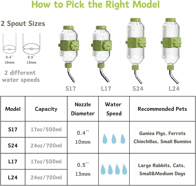 Pet Water Bottle[S24, 24oz], Hanging Dog Water Dispenser Kennel Plastic Drinker Kettle Feeder BPA Free Cage Crate Hutch Puppy Cat Rabbit (Guniea Pigs-Small Bunnies-Chinchillas)