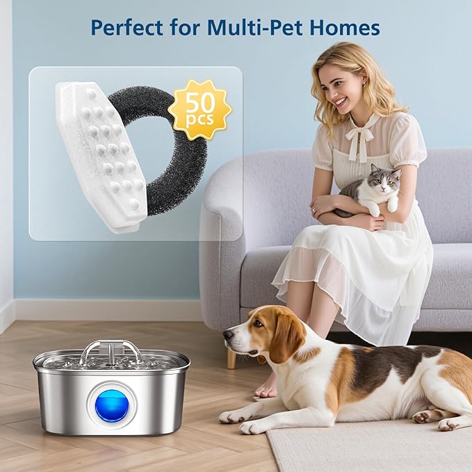 50 Pack Cat Fountain Replacement Filters for Rellaty & Neareal Stainless Steel 108oz/3.2L Adjustable Water Flow Pet Water Fountain(25 Filters & 25 Sponges)