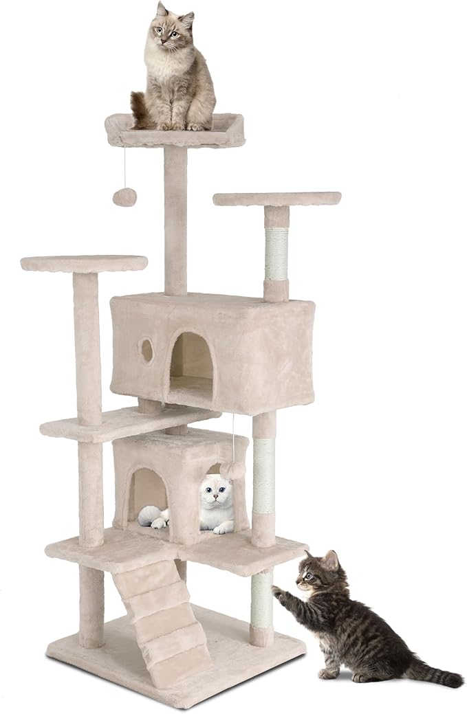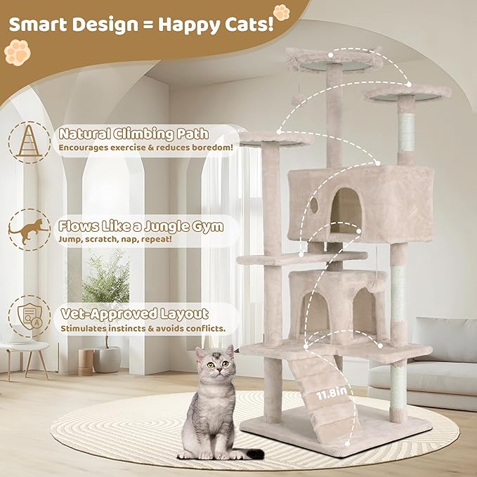 54" Cat Tree for Indoor Cats - Multi-Level Cat Tower with Scratching Posts, Jumping Platforms, Spacious Condo, Cat Bed Cave & Hidden Spaces - Durable Cat Furniture - Beige