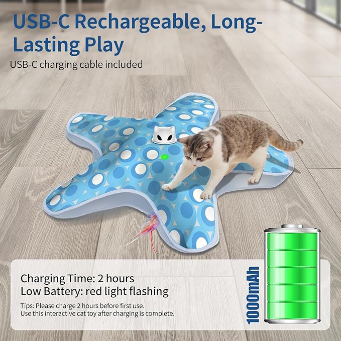 - USB-C Rechargeable & 1000mAh Battery: This rechargeable cat toy comes with a high-capacity rechargeable battery, charging voltage: 5V/1A, supports Type-C charging, eliminating the need for disposable batteries and reducing waste. It comes with a USB cable for convenient charging, which can be fully charged in 2-3 hours, allowing your cat to enjoy several days of self-play time. (Please charge the product for 2 hours upon first use.)