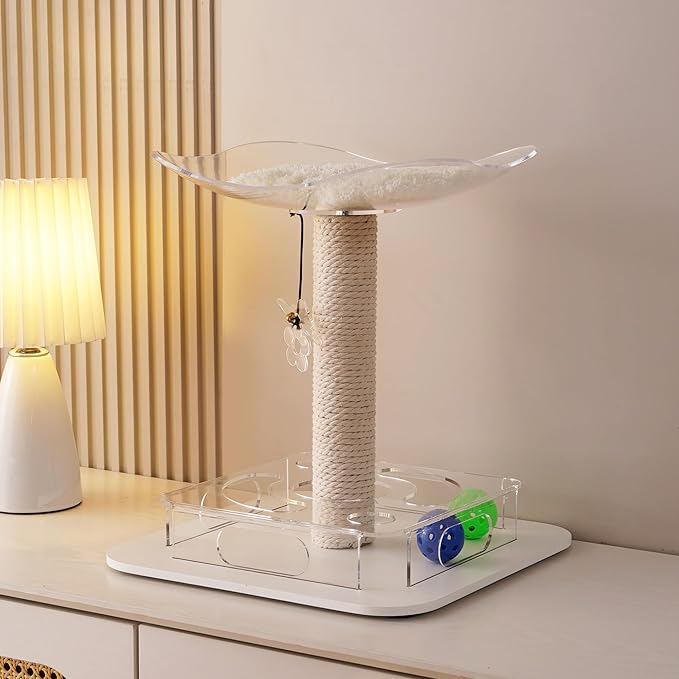 Kicari Modern 3-in-1 Interactive Cat Toy, Puzzle Box Cat Puzzle Toys for Indoor Cats with Bed/Perch, Small Cotton Scratching Posts, Colorful Jingle Balls, Dangling Toy Accent, Acrylic White