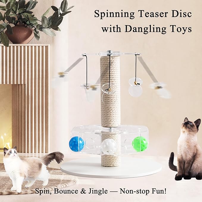 - 【3-in-1 Cat Toys for Indoor Cats】Kitten scratching post, spinning interactive cat toy, and spinning teaser disc all in one — designed to satisfy your cat's natural instincts to scratch, chase, and bat. From curious kittens to playful adults, it keeps them active and happy every day.