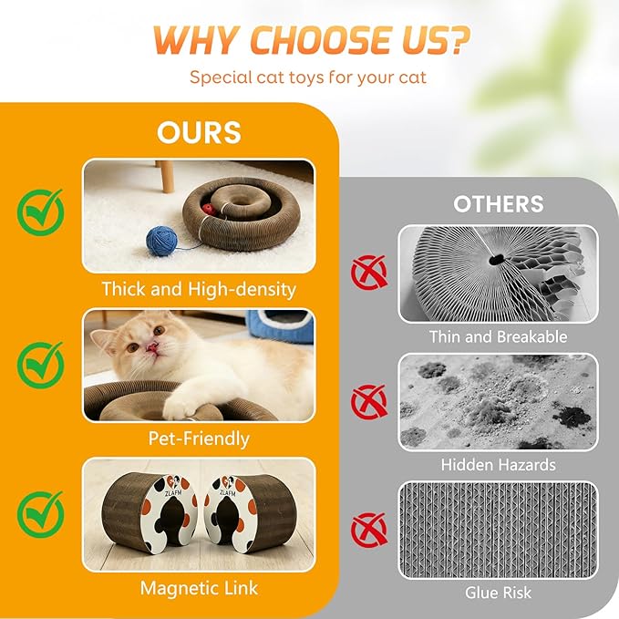 - Innovative magnetic infinite docking: Our Cat Scratching Pad is crafted from premium corrugated cardboard and features powerful magnetic adhesion. Unlike conventional scratchers, our innovative magnetic docking system guarantees each panel stays securely connected. This design allows for endless connections and configuration possibilities: build arched tunnels, circular mazes, multi-level towers, or any custom shape tailored to your cat's size and play style—from energetic kittens to majestic Maine Coons.